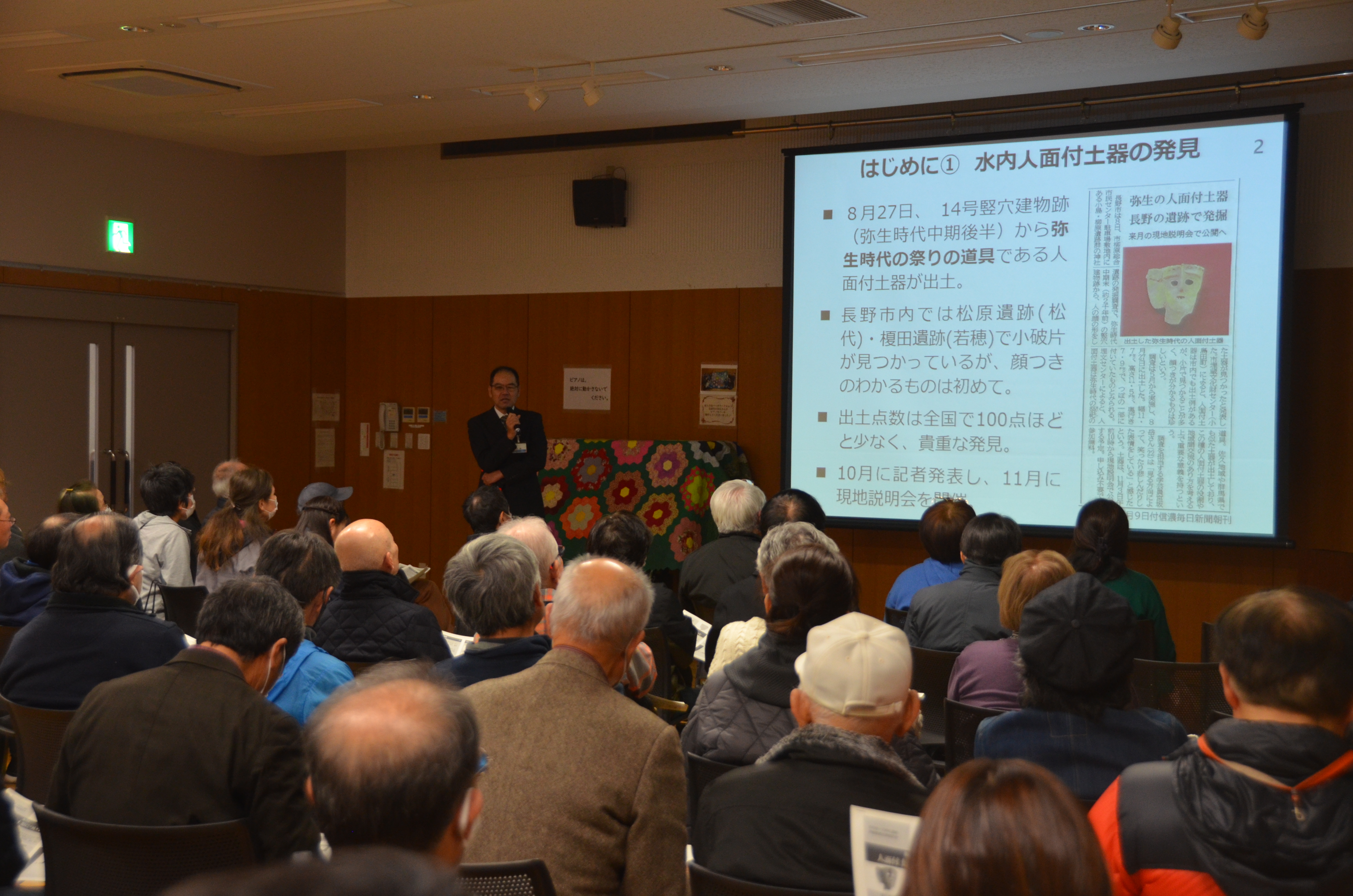 報告会では、発掘調査の成果と来年度の課題、そして出土した人面付土器の特徴や役割について埋蔵文化財センター学芸員が解説しました。