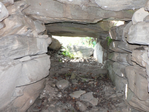 墳丘は積石墳丘で直径16.7m、高さ4.5mを測る円墳です。墳丘頂部が大きく崩れ、天井石が露出しています。埋葬施設は羨道の一部を欠損していますが、全長8.8m、玄室長6.5m、玄室幅1.9m、玄室高2.35mを測る横穴式石室です。玄室規模は大室古墳群中で墳丘・石室ともに最大規模となる大室谷支群の244号墳の長さ6.5m、幅2.3m、高さ2.5mに匹敵し、大室古墳群で最も大きな石室のひとつとなります。横穴式石室は、玄室と羨道を区分する玄門部に特別な構造を持たない「無袖式」に分類されます。玄室の奥壁は一枚石による「鏡石」は使用されていなく、板状石を長手積みした多段積みの構造となっています。また、側壁は最も下段の基底石(腰石)が一般的な横位ではなく、縦位に使われていることが特徴となります。大室古墳群中では大室谷支群の187号墳やD号墳、金井山支群の466号墳などで同様な特徴が見られますが、少数派です。こうした石材の使用方法は「腰石を立てる横穴式石室」として注目され、朝鮮半島との関係に注意が払われています。