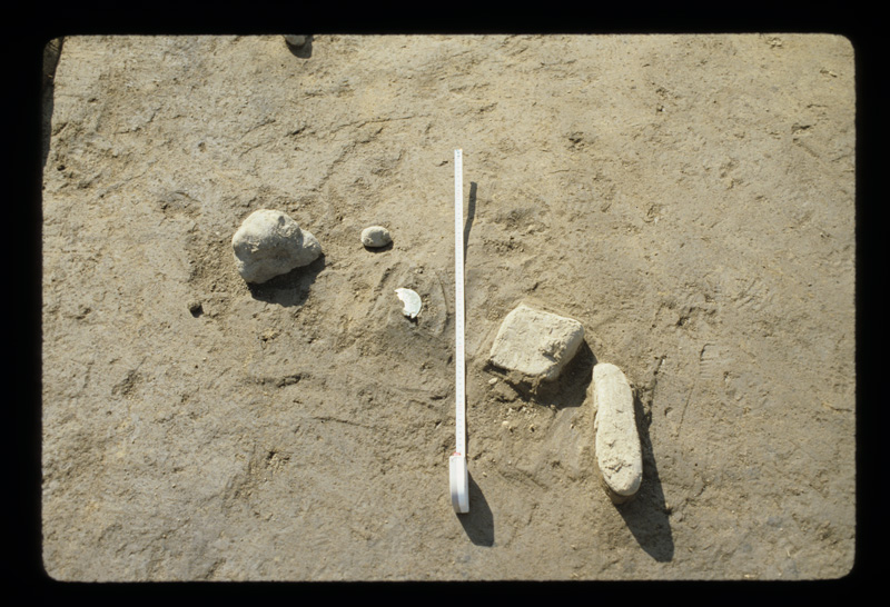 - 48号住居跡は46号住居跡の北側下面で検出された隅丸方形住居で、規模は3.7×3.8mをはかります。床面は貼床がされており、主柱穴が2個確認されました。中央北壁寄りには70~100cmほどの範囲に厚さ10cmほどの炭化物が認められ、地床炉と判断されます。中央東側の礫で囲まれた箇所からは内行花文鏡が出土しています。白銅製で径6.7cmの半欠品で、床面上に裏面を上にして出土しました。その他の出土遺物は極めて少なく、甕、高杯、坩の破片が出土しているのみです。