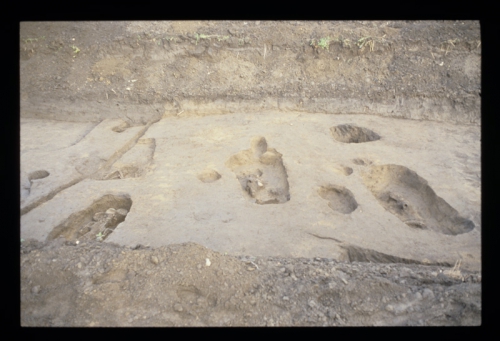 - 第Ⅲ墓坑群は本調査区でもっとも密集した墓坑群で、14基の木棺墓や墓坑などが見つかっています。このうち、21号木棺墓からは副葬された多量の土器が見つかっており、特筆されます。14基のうち、11号墓坑は平安時代の合口甕棺墓(あわせぐちかめかんぼ)です。