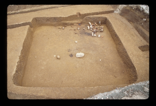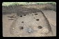 - 平成5年度に行なわれた発掘調査で見つかりました。大きさは一辺5.1mの方形で、平安時代、10世紀前半頃のものと考えられます。この住居跡は周りの住居跡に比べて一回り大きく、この時期の集落の中核となる建物であったと思われます。住居内には、東壁に設けられたカマドとは別に、中央付近に鍛冶炉がありました。この住居跡からは土師器の杯や椀、灰釉陶器の碗が出土しています。