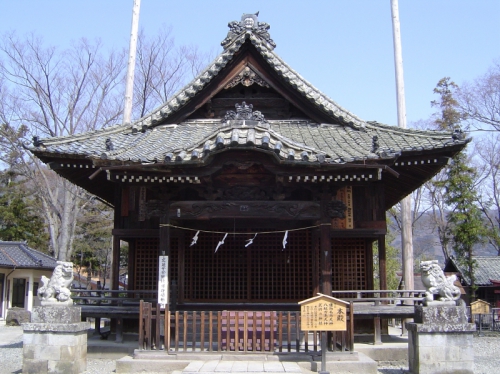 拝殿は文化12年(1815)に建てられたもので、桁行(けたゆき)7間、梁間(はりま)3間規模、入母屋(いりもや)造、桟瓦(さんがわら)葺、妻入(つまいり)の社殿である。正面向拝は唐破風(からはふ)付きで、彫刻で飾る。内部は2室で、奥間の床を一段高くする。正面1間を吹放し、3方に縁を廻す。鬼瓦には、真田家の家紋である六連銭(むつれんせん)を表す。本殿と同年代の建立一体となって歴史的景観を形成している。