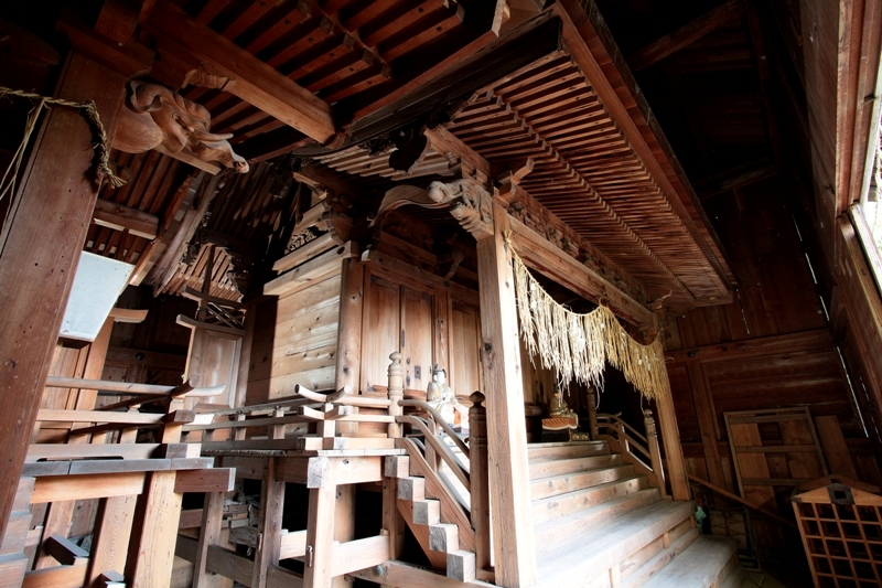 本殿の装飾は、大変に質素な建築となっているのに対し、拝殿は目に触れることを前提として建設されているため、本殿に比して、彫刻を多用し、内部に障壁画、天井には格天井が張られ、格式ある空間として造られています。また、拝殿の床から二段上がった神官の空間である祝詞殿を突出して設けるなど、立地環境との関わりで特異な空間構成となっています。従って拝殿の屋根伏は、向拝も含めると十字形を呈する屋根形状となっています。